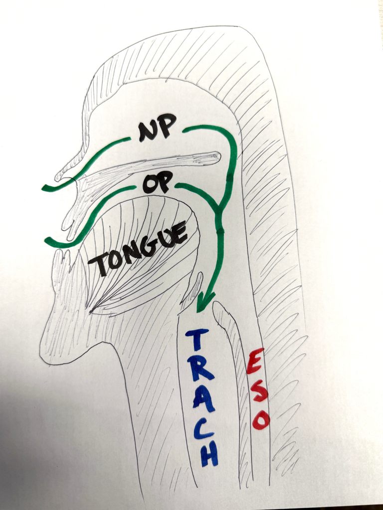 The point to take away from this picasso is that there are two ways to deliver air flow to the trachea (windpipe), either through the nose or the through the mouth. The tongue here is basically to scale: it’s enormous, and has a nasty habit of getting in the way of attempts to ventilate through the mouth. Also worthy of note: any airflow delivered through either the nose or the mouth is directed at both the trachea and esophagus until an iGel LMA or more advanced airway is in place.